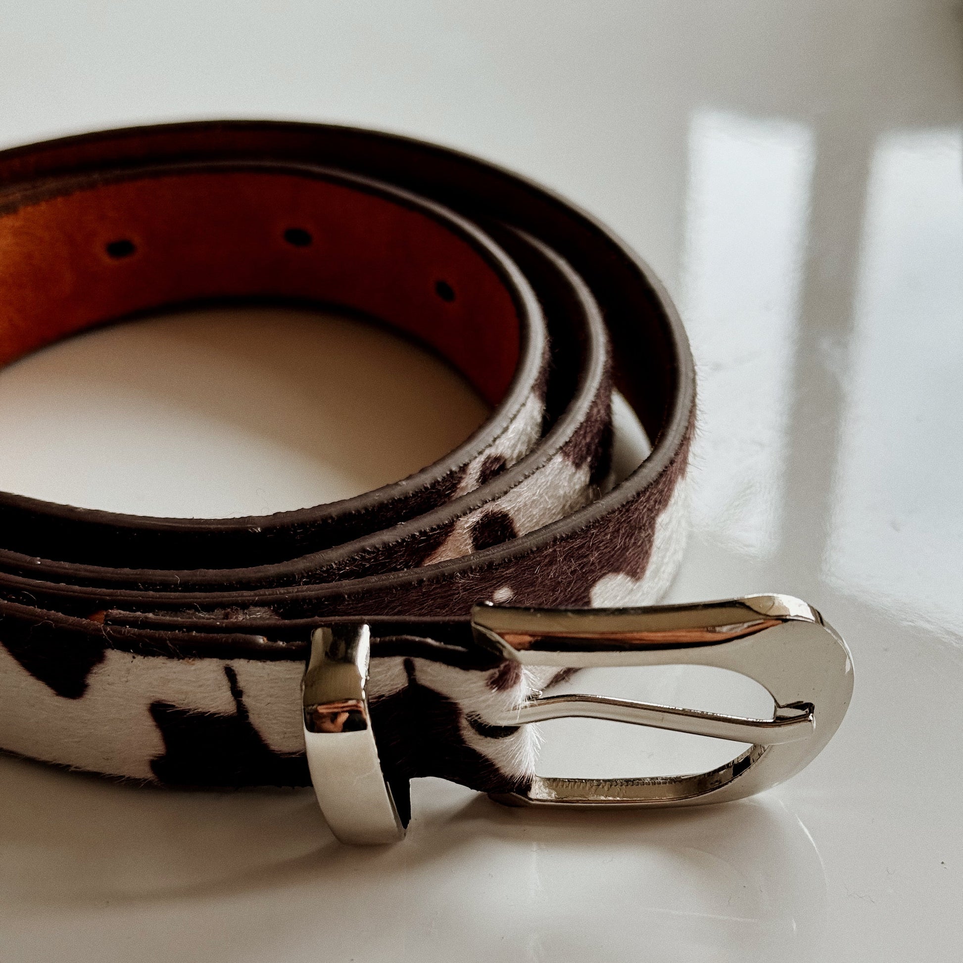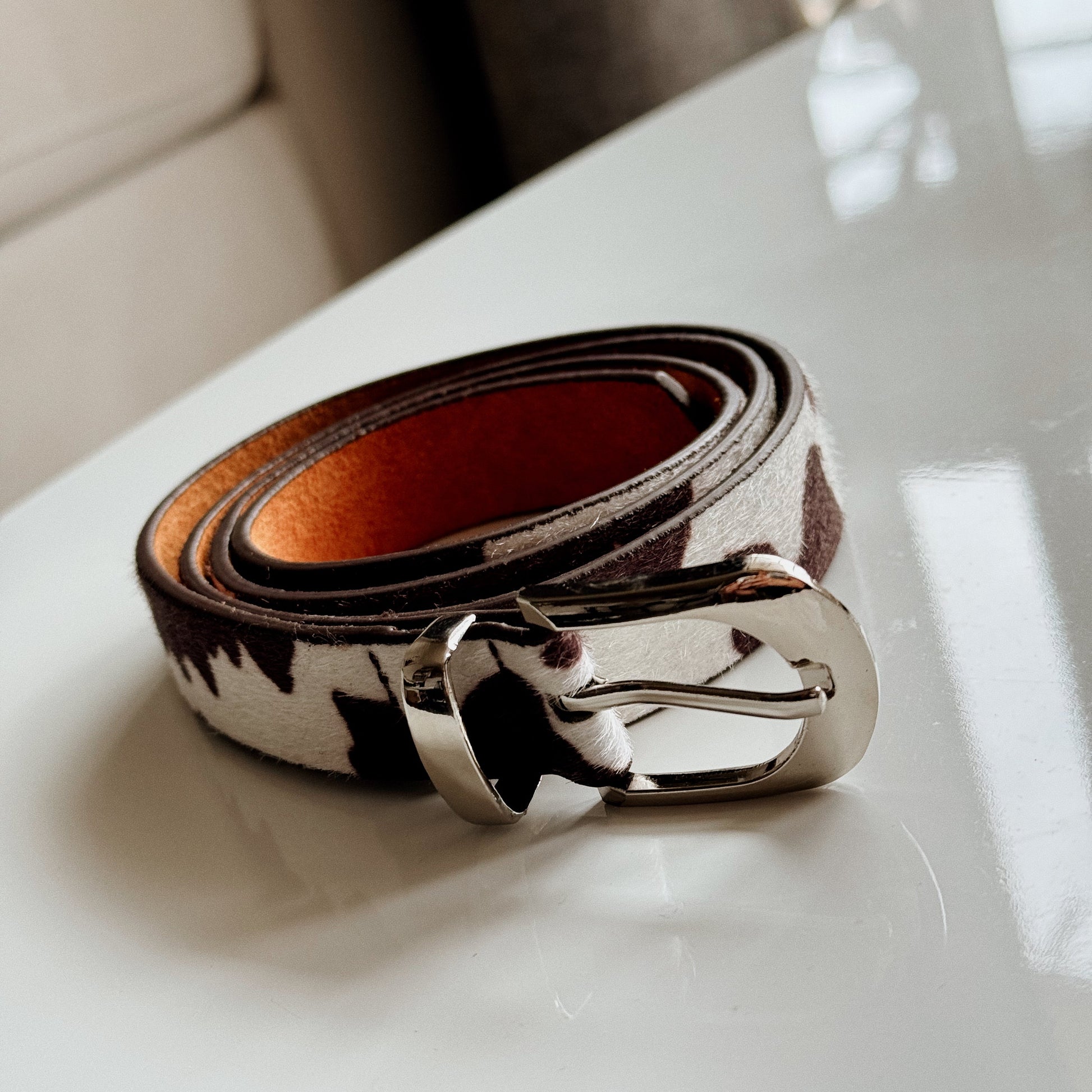 Cinturón con estampado estilo vaca y hebilla plateada (3 x 4 cm).