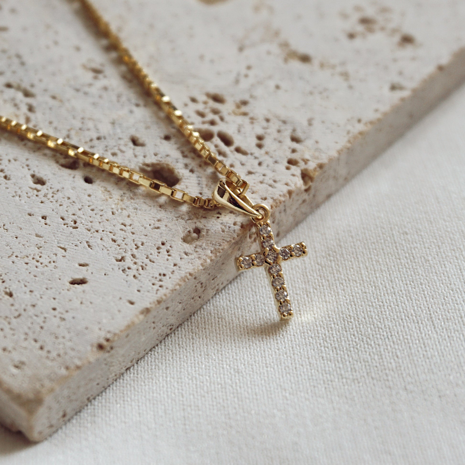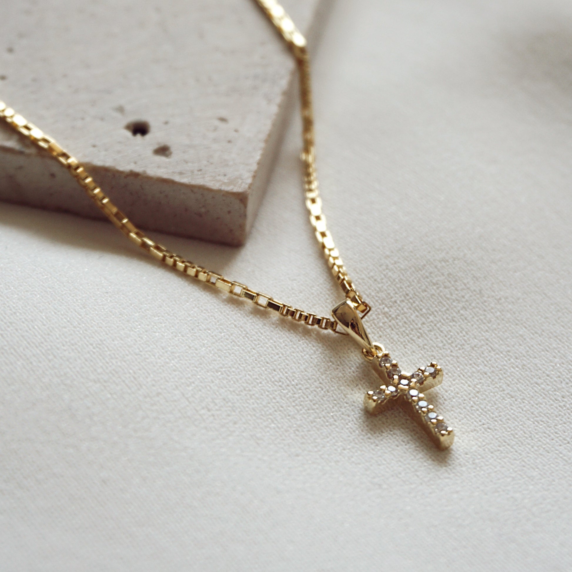El collar Cruz Circón delicado y atemporal para tu día a día. Una cadena con material bronce enchapado en oro de 18k, 3 micras. El largo es de 45cm. El colgante mide 12mm. Es perfecto para regalo o autoregalo!